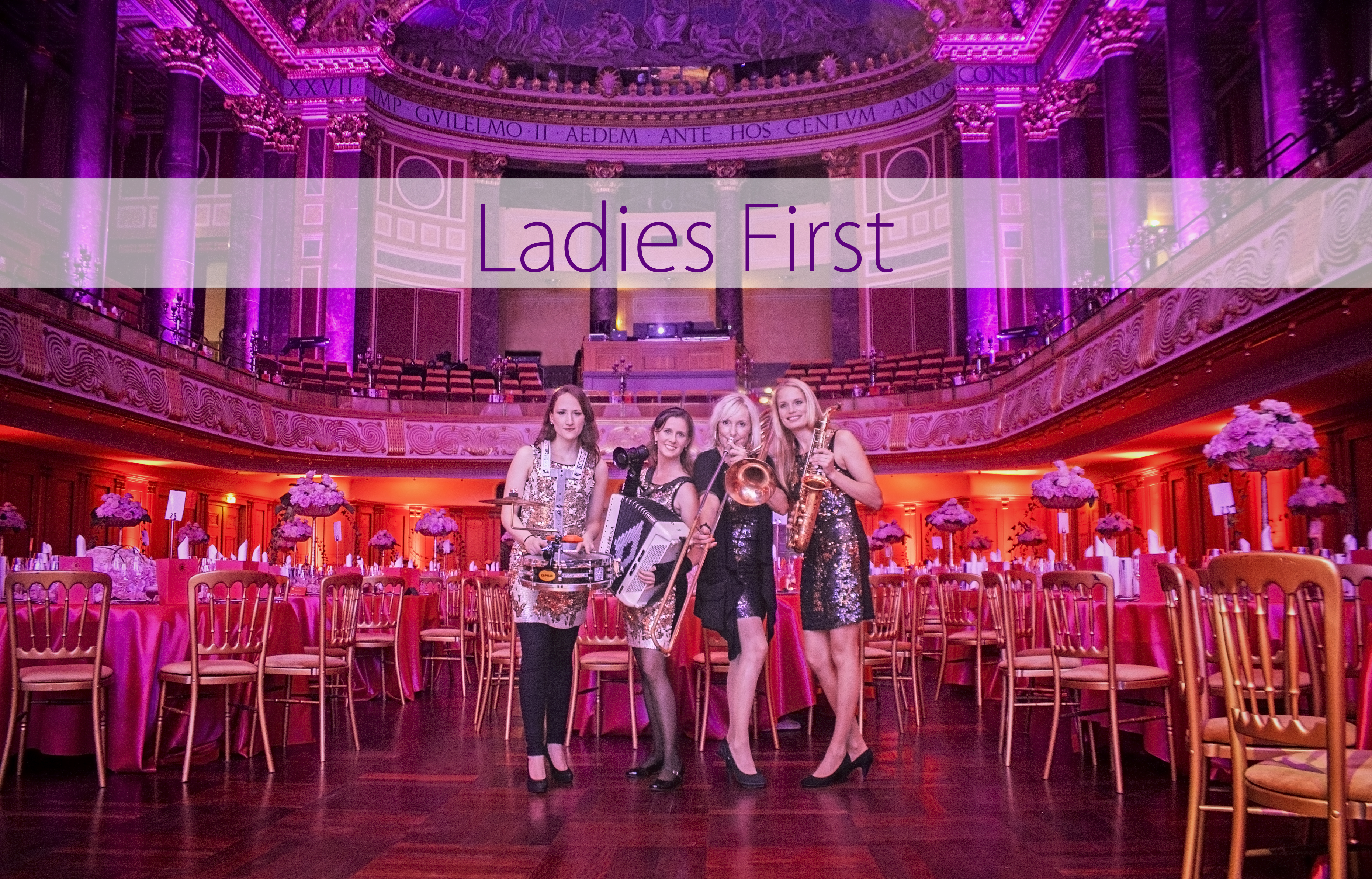 Ladies First, der wohl zarteste Walkact seit es Streetbands gibt. Das ist spektakulär, elegant und es ist hochklassig: Nach Sportler Galas, der olympischen Ballnacht und vielen anderen Top Events stehen für die Damen von "Ladies First" schon zahlreiche Termine und auch TV Aufzeichnungen im Kalender. Ob Pop oder Swing, ob instrumental oder mit Gesang: Die "Ladies" wissen, wie sie ihr Publikum mitreißen. Eleganz gepaart mit Professionalität. Das macht den feinen Unterschied!